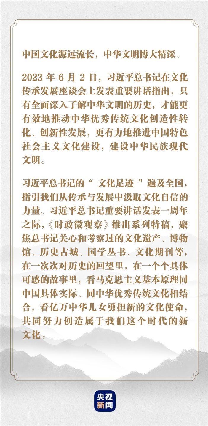 “這段時(shí)間,我一直在思考推進(jìn)中國(guó)特色社會(huì)主義文化建設(shè)、建設(shè)中華民族現(xiàn)代文明這個(gè)重大問題?!?023年6月2日,在文化傳承發(fā)展座談會(huì)上,習(xí)近平總書記指出,“只有全面深入了解中華文明的歷史,才能更有效地推動(dòng)中華優(yōu)秀傳統(tǒng)文化創(chuàng)造性轉(zhuǎn)化、創(chuàng)新性發(fā)展,更有力地推進(jìn)中國(guó)特色社會(huì)主義文化建設(shè),建設(shè)中華民族現(xiàn)代文明。”