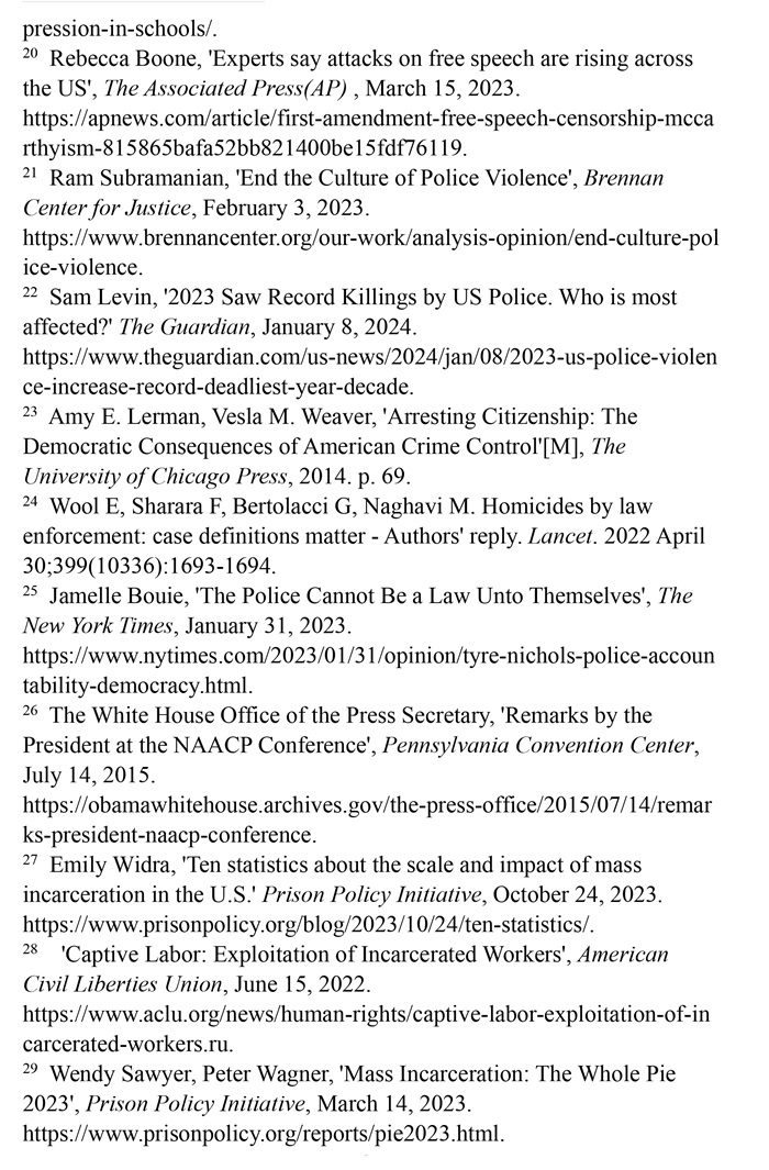 非洲裔在執(zhí)法領(lǐng)域面臨嚴(yán)重種族歧視。2023年1月3日,洛杉磯31歲的非洲裔男子基南·安德森涉嫌交通肇事,警方在制服他的過程中使用電擊槍擊中其6次,致其心臟病發(fā),送醫(yī)不治身亡。(注39)2023年1月7日,田納西州孟菲斯市的警察以“魯莽駕駛”為由將29歲的非洲裔男子泰爾·尼科爾斯攔下,并對其進(jìn)行長達(dá)數(shù)分鐘的殘忍毆打。三天后尼科爾斯因傷勢過重去世,而事后的調(diào)查無法證實警察關(guān)于其“魯莽駕駛”的說法。(注40)這兩起非洲裔遭受警察暴力執(zhí)法身亡案例引發(fā)多名聯(lián)合國專家的高度關(guān)注。專家們強(qiáng)調(diào),在兩起事件中,警察使用的武力違反保護(hù)生命權(quán),禁止酷刑和其他殘忍、不人道或有辱人格待遇或處罰的國際準(zhǔn)則,也不符合聯(lián)合國《執(zhí)法人員行為守則》和《執(zhí)法人員使用武力和火器的基本原則》。(注41)聯(lián)合國人權(quán)理事會在執(zhí)法工作中推進(jìn)種族正義和平等的國際獨立專家機(jī)制在對美國實地訪問后發(fā)布報告指出,針對非洲裔的系統(tǒng)性種族主義已經(jīng)滲透到美國警察隊伍和刑事司法系統(tǒng)。非洲裔被警察殺害的可能性是白人的3倍,被監(jiān)禁的可能性是白人的4.5倍。在每年1000多起警察殺人案件中,只有1%的涉事警察被指控。報告警告說,美國如果不按照國際標(biāo)準(zhǔn)改革警察使用武力的規(guī)則,許多殺戮將繼續(xù)發(fā)生。(注42)