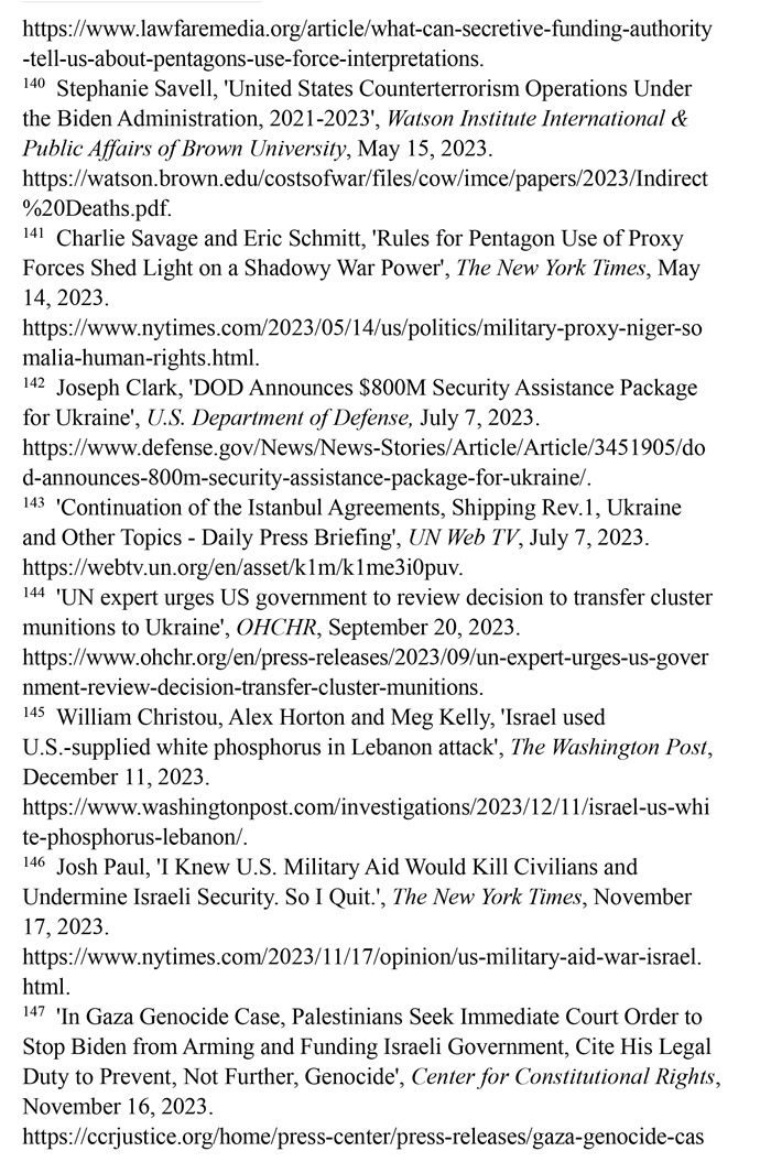 持續(xù)向沖突地區(qū)提供武器。美國國防部2023年7月7日發(fā)布的新聞稿顯示,美國向烏克蘭提供的價值8億美元的額外軍事援助中,包含大量集束彈藥。(注142)聯(lián)合國秘書長副發(fā)言人哈克2023年7月7日回答記者提問時表示,聯(lián)合國秘書長安東尼奧·古特雷斯希望各國遵守《集束彈藥公約》,不要在戰(zhàn)場上繼續(xù)使用集束彈藥。(注143)聯(lián)合國人權(quán)高專辦網(wǎng)站2023年9月20日報道,聯(lián)合國人權(quán)理事會酷刑和其他殘忍、不人道或有辱人格的待遇或處罰問題特別報告員愛麗絲·吉爾·愛德華茲2023年7月向美國政府發(fā)出緊急信函,警告集束彈藥會對平民造成嚴(yán)重傷害。(注144)《華盛頓郵報》網(wǎng)站2023年12月11日報道,美國每年流入以色列的軍火達(dá)數(shù)十億美元,以色列在10月對黎巴嫩南部的一次襲擊中使用了美國供應(yīng)的白磷彈藥,造成至少9名平民受傷。(注145)美國國務(wù)院政治軍事事務(wù)局前局長喬希·保羅2023年10月18日在《紐約時報》網(wǎng)站發(fā)表專欄文章指出,美國每年向以色列提供至少38億美元軍事援助,加沙地帶最嚴(yán)重的人員傷亡大多是由美國提供的彈藥所導(dǎo)致,譴責(zé)這種軍事援助無視人權(quán)問題。(注146)美國人權(quán)組織“憲法權(quán)利中心”2023年11月16日報道,滅絕種族與死刑問題專家威廉·沙巴斯指責(zé)美國未能履行防止種族滅絕的法律義務(wù),違反了習(xí)慣國際法和《防止及懲治滅絕種族罪公約》。(注147)