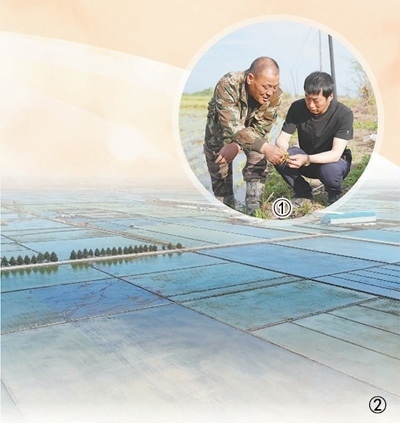 圖①:于海河(右)在田間地頭和村民一起查看水稻長勢。 本報(bào)記者 方 圓攝圖②:完成了機(jī)械化插秧的水稻田?;⒘质形麄鞑抗﹫D