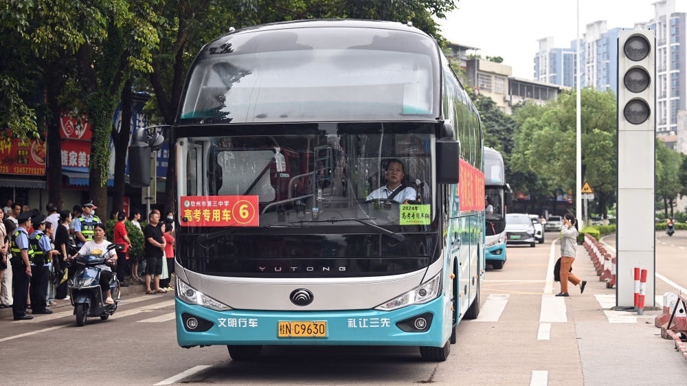 ↑6月7日,在廣西欽州市第二中學(xué)考點(diǎn),高考專用車接送考生應(yīng)考。