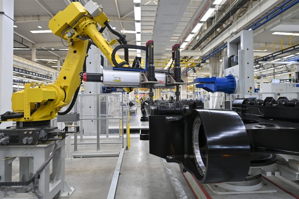 2024年4月9日,在山西太原太重集團智能高端液壓挖掘機產(chǎn)業(yè)園區(qū),智能裝配機器人在智能生產(chǎn)線上作業(yè)。