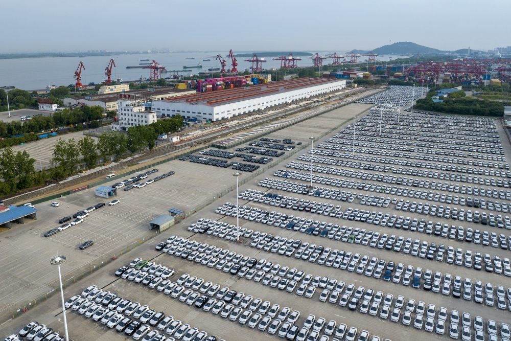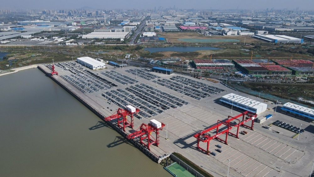 2024年5月26日,在安徽蕪湖港朱家橋港區(qū)國際集裝箱碼頭,整齊排列的汽車等待出口(無人機(jī)照片)。作為安徽省首個(gè)國家一類開放口岸,蕪湖港現(xiàn)已發(fā)展成為長(zhǎng)三角城市群綜合交通運(yùn)輸體系的重要樞紐。