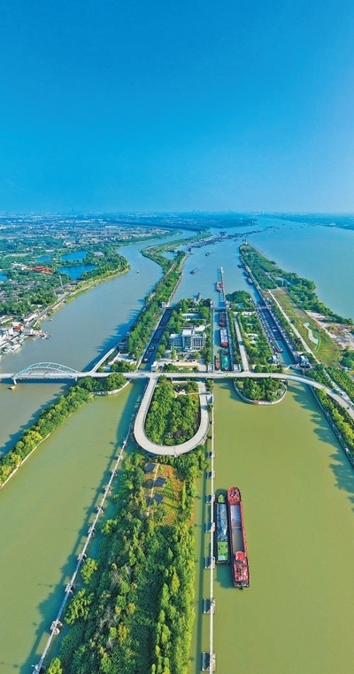 生態(tài)保護(hù)船只有序通過(guò)揚(yáng)州邵伯船閘。本報(bào)記者 雷 聲攝