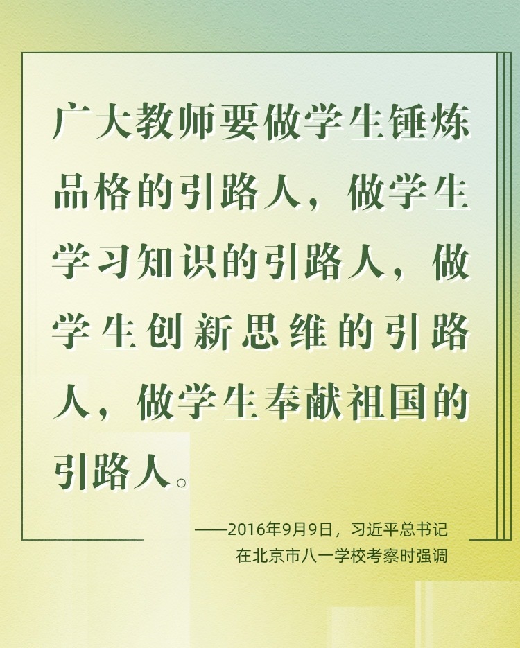 他們帶領(lǐng)學(xué)生前行,更新舊知、開掘新知、探索未知;他們肩負(fù)光榮使命,為黨育人、為國(guó)育才、為民育未來(lái)。守教育報(bào)國(guó)初心、擔(dān)立德樹人使命、圓民族復(fù)興之夢(mèng),建設(shè)社會(huì)主義現(xiàn)代化強(qiáng)國(guó)之路上,教育家精神自當(dāng)念茲在茲、代代傳承、光芒永綻。