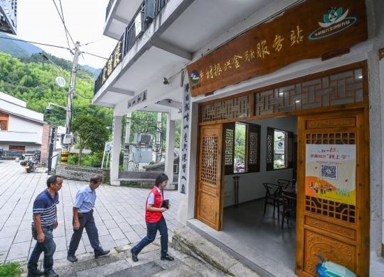 在浙江省麗水市青田縣方山鄉(xiāng)的鄉(xiāng)村振興金融服務(wù)站內(nèi),青田農(nóng)商銀行服務(wù)隊(duì)志愿者上門(mén)服務(wù),打通金融服務(wù)“最后一公里”。新華社記者徐昱 攝