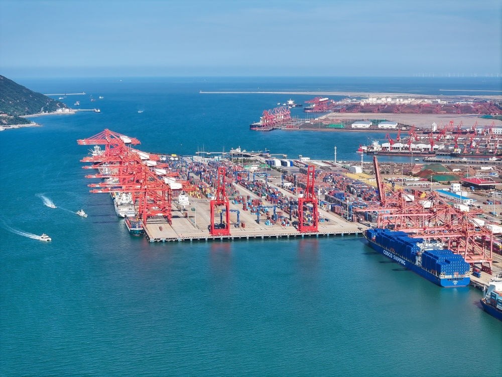 貨輪??吭谶B云港港集裝箱碼頭(2024年6月26日攝,無人機照片)。