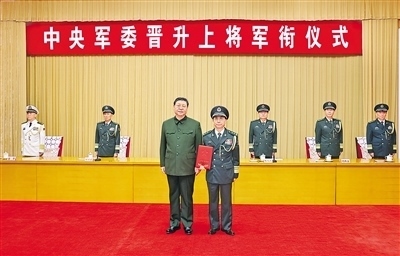 下午4時許,晉銜儀式在莊嚴的中華人民共和國國歌聲中開始。中央軍委副主席張又俠宣讀了中央軍委主席習(xí)近平簽署的晉升上將軍銜命令。中央軍委副主席何衛(wèi)東主持晉銜儀式。