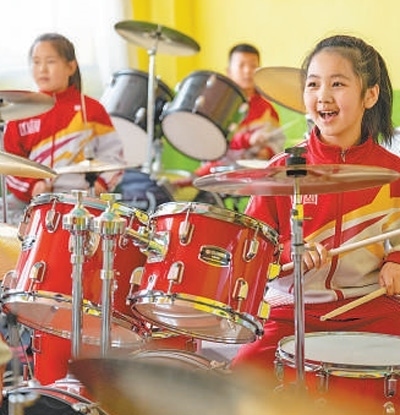 黑龍江省安達市任民鎮(zhèn)中心小學(xué),學(xué)生們在教室練習(xí)架子鼓。新華社記者 謝劍飛攝