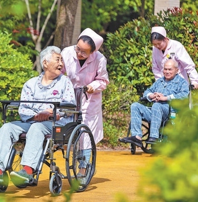 江蘇省南通市通州區(qū)一家頤養(yǎng)中心,護理人員推著老人在花園散心。翟慧勇攝(影像中國)