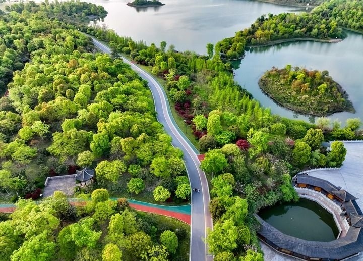 這是2022年4月5日拍攝的江西省萍鄉(xiāng)市萍水湖濕地公園(無人機(jī)照片)。萍鄉(xiāng)市將治水與綠化相結(jié)合,沿萍水河打造萍水湖濕地公園。新華社發(fā)(李桂東 攝)