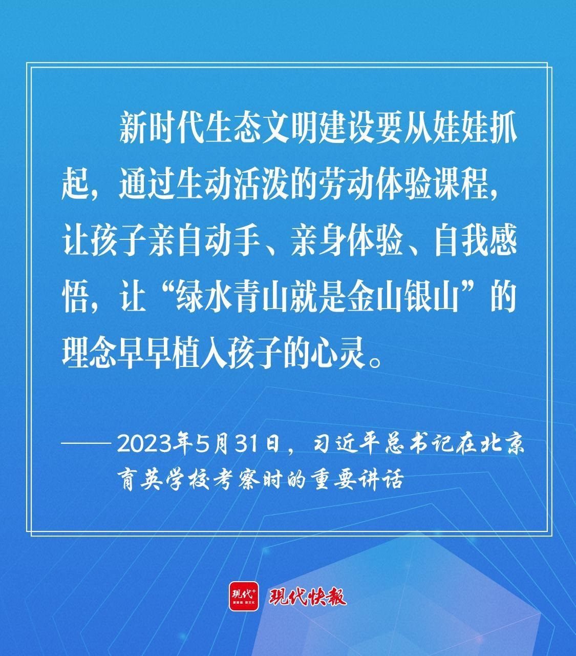 2023年5月,習近平總書記在北京育英學??疾鞎r強調(diào),新時代生態(tài)文明建設要從娃娃抓起,通過生動活潑的勞動體驗課程,讓孩子親自動手、親身體驗、自我感悟,讓“綠水青山就是金山銀山”的理念早早植入孩子的心靈。