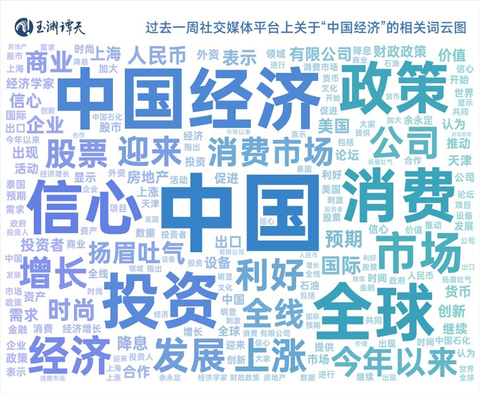 譚主對過去一周社交媒體平臺上“中國經(jīng)濟(jì)”相關(guān)的討論進(jìn)行大數(shù)據(jù)分析,得到了這樣一張圖。