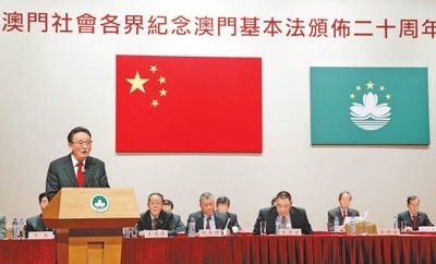 2013年2月21日,吳邦國同志在澳門文化中心出席澳門社會各界紀(jì)念澳門基本法頒布20周年啟動大會并發(fā)表講話。新華社記者 鞠 鵬攝