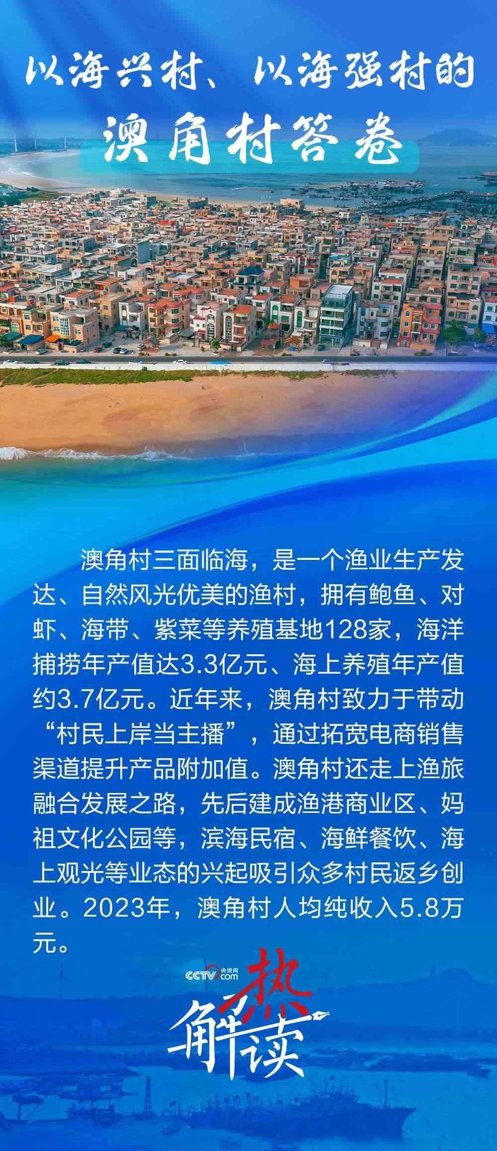 澳角村三面臨海,近年來(lái)走出了一條以海興村、以海強(qiáng)村的新路子??吹洁l(xiāng)村發(fā)生了巨變,總書(shū)記直言“鄉(xiāng)村振興還是要發(fā)揚(yáng)優(yōu)勢(shì)”,并勉勵(lì)澳角村做好“?!钡奈恼?,在鄉(xiāng)村振興、共同富裕的道路上一往無(wú)前。