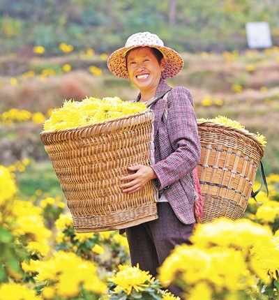 重慶市黔江區(qū)鄰鄂鎮(zhèn)松林村村民采摘金絲皇菊。楊 敏攝(人民視覺)