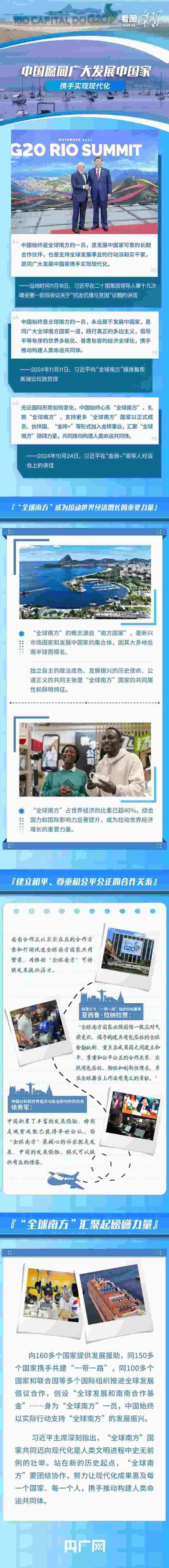 當(dāng)?shù)貢r(shí)間11月18日,習(xí)近平主席在G20峰會(huì)第一階段會(huì)議就“抗擊饑餓與貧困”議題發(fā)表重要講話,呼吁作為世界主要大國(guó)領(lǐng)導(dǎo)人應(yīng)該秉持命運(yùn)共同體意識(shí),扛起歷史責(zé)任、展現(xiàn)歷史主動(dòng)、推動(dòng)歷史進(jìn)步。習(xí)主席表示,中國(guó)始終是“全球南方”的一員,是發(fā)展中國(guó)家可靠的長(zhǎng)期合作伙伴,并宣布中國(guó)支持全球發(fā)展的八項(xiàng)行動(dòng),愿同各方一道行動(dòng),建設(shè)一個(gè)共同發(fā)展的公正世界。