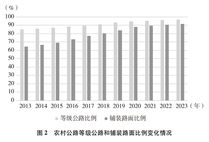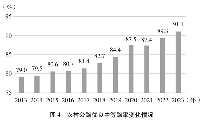 技術(shù)等級逐年提高。截至2023年底,農(nóng)村公路等級路②里程及比例分別達到445萬公里和96.8%,鋪裝路面里程及比例分別達到422萬公里和91.8%,十年間分別提高了11.9個百分點、27.2個百分點。