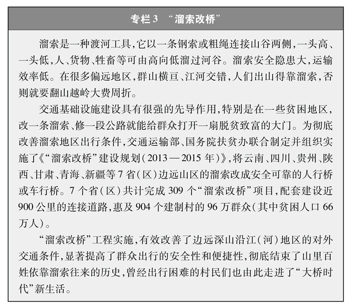 解決特殊地區(qū)出行難題。改一條溜索、修一段公路就能給群眾打開一扇脫貧致富的大門。為了保障偏遠山區(qū)百姓安全出行,推動“溜索改橋”建設(shè),專項資金支持、精心組織實施,用3年時間徹底改善了溜索地區(qū)出行條件(專欄3)。推進“直過民族”③和人口較少民族聚居區(qū)農(nóng)村公路建設(shè),解決民族地區(qū)交通閉塞的突出問題,加快民族地區(qū)脫貧致富步伐。