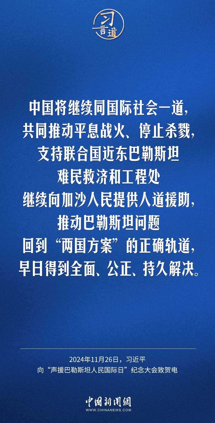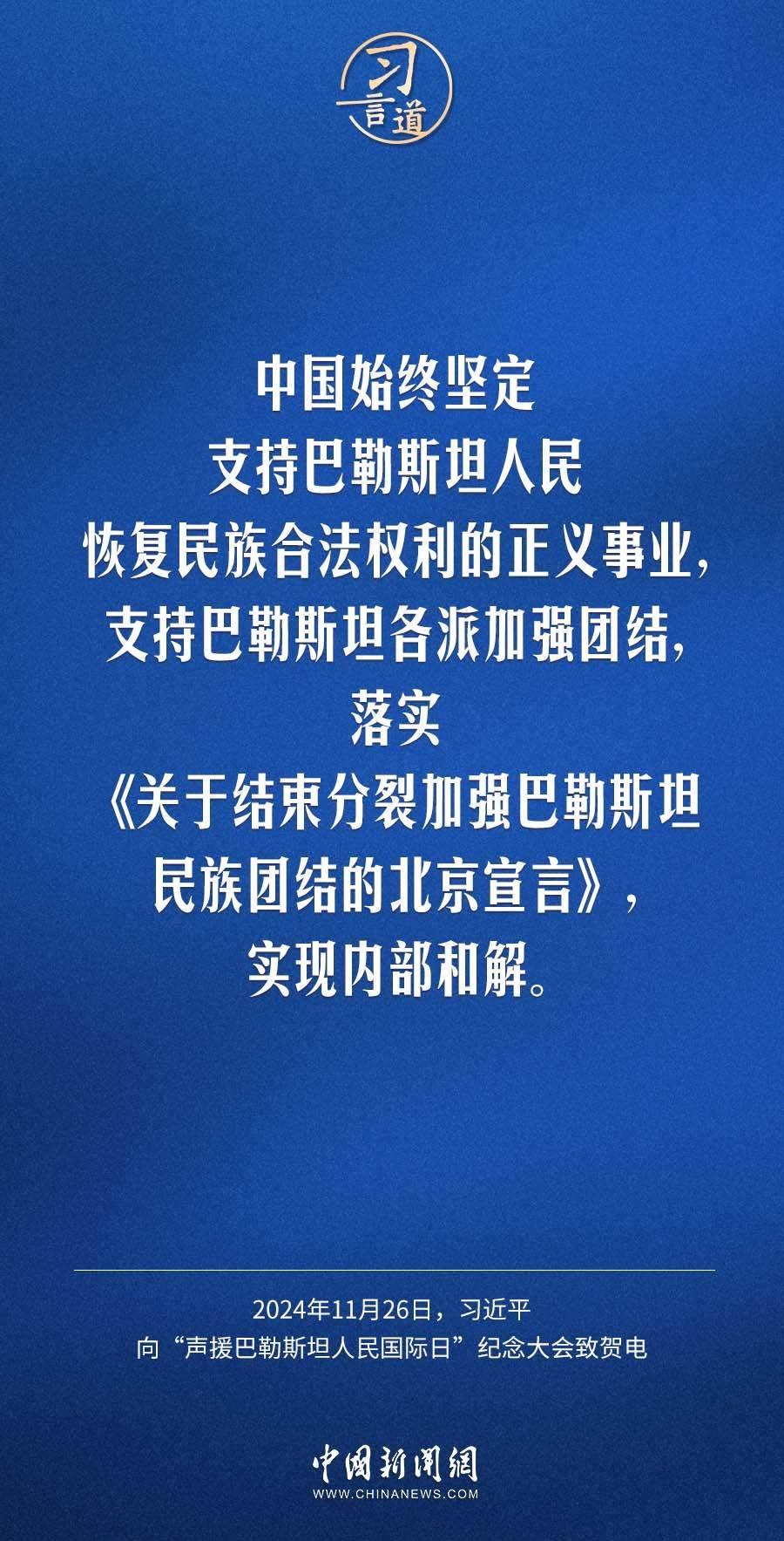 11月26日,聯(lián)合國舉行“聲援巴勒斯坦人民國際日”紀念大會,國家主席習近平向大會致賀電。習近平指出——