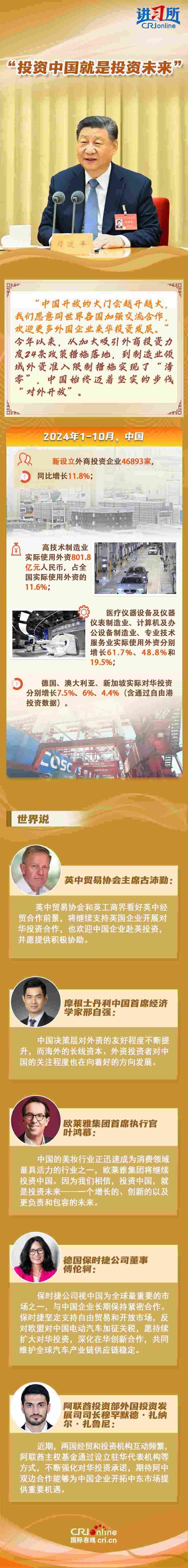 “中國是實干家、行動派?!苯衲暌詠恚瑥牧?xí)近平主席的歐洲之行到拉美之行,再到四天前在北京會見主要國際經(jīng)濟(jì)組織負(fù)責(zé)人,習(xí)近平一直強(qiáng)調(diào),中國的發(fā)展將給世界帶來巨大機(jī)遇。據(jù)聯(lián)合國貿(mào)易和發(fā)展會議不久前發(fā)布的《世界投資報告2024》中文版顯示,中國吸引外資的結(jié)構(gòu)不斷優(yōu)化、質(zhì)量不斷提高,多位政商界人士也認(rèn)為中國是一個非常有前景的市場,投資中國就是投資未來。