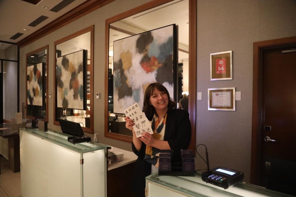 當(dāng)?shù)貢r(shí)間1月28日,馬斯卡廷一家酒店前臺工作人員謝伊·馬丁展示自己為迎接中國學(xué)生而手繪的中文指引卡片。新華社記者徐劍梅攝