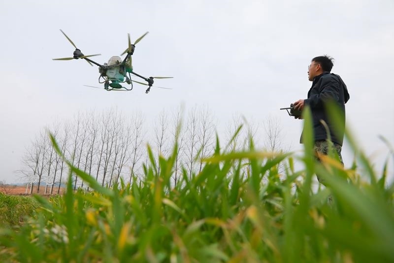 △2025年2月14日,在浙江杭州市臨安區(qū)天目山鎮(zhèn)“天目糧倉”糧食功能區(qū),農機人員遙控植保無人機給小麥施肥。
