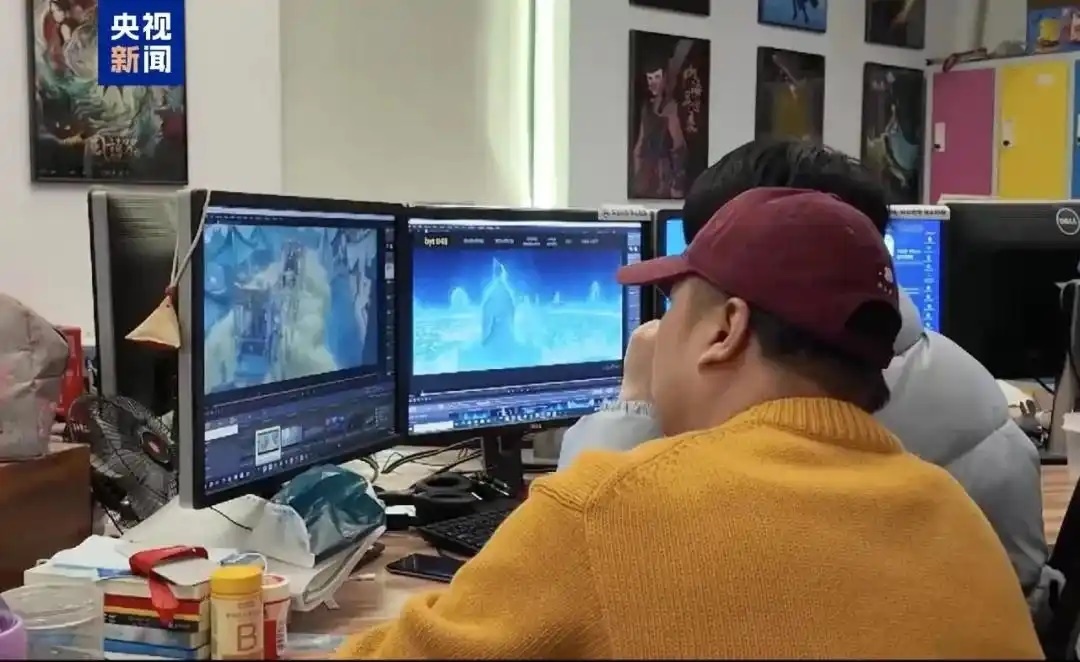 △《哪吒2》壯觀的特效背后,是全國138家動(dòng)畫公司的合力托舉。圖為創(chuàng)作團(tuán)隊(duì)正在確認(rèn)畫面效果。