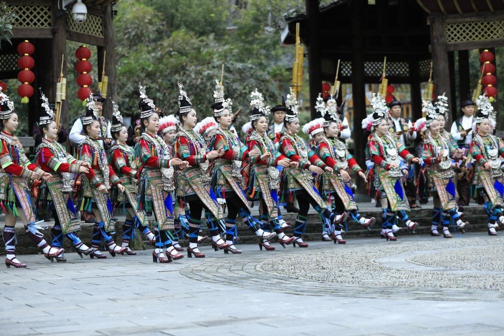 近日,侗族群眾在黎平縣肇興侗寨寨門前演唱侗族大歌迎接賓客。吳光輝 攝