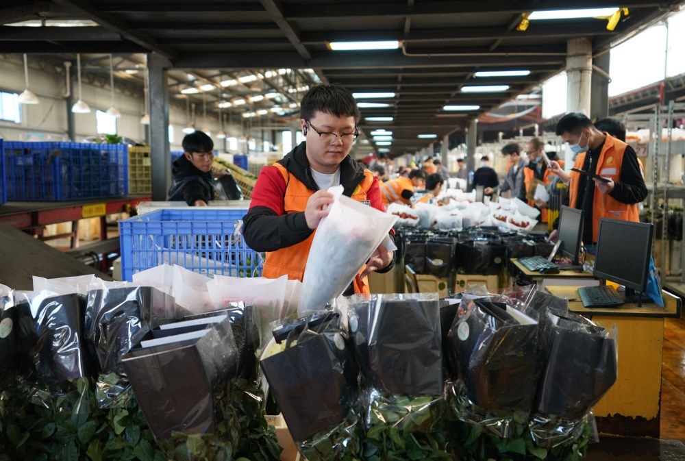 2022年11月11日,工作人員在昆明斗南花市給鮮花貼標(biāo)簽??爝f物流時效不斷優(yōu)化、冷鏈運(yùn)輸技術(shù)持續(xù)提升,也為中國鮮花加速“出海”保駕護(hù)航。