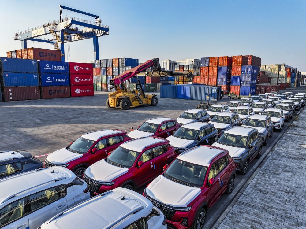 2024年10月28日在重慶國(guó)際物流樞紐園區(qū)西部陸海新通道重慶無(wú)水港拍攝的出口汽車裝運(yùn)現(xiàn)場(chǎng)(無(wú)人機(jī)照片)。位于重慶市沙坪壩區(qū)的重慶國(guó)際物流樞紐園區(qū),是重慶中歐班列、西部陸海新通道班列、渝滿俄班列、渝甬班列的主要到發(fā)點(diǎn),截至2024年10月,已開通班列線路62條,輻射125個(gè)國(guó)家和地區(qū)的542個(gè)港口。