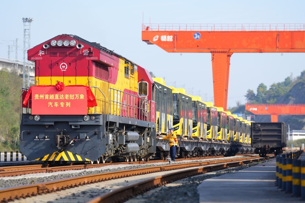 2024年10月28日,裝載著28輛“貴州造”新能源客車的出口專列停靠在貴陽(yáng)國(guó)際陸港都拉營(yíng)站,準(zhǔn)備經(jīng)由云南磨憨口岸出境前往老撾萬(wàn)象。這是貴州的中老班列首次整列直發(fā),也是貴州本土生產(chǎn)的新能源客車首次出口老撾。