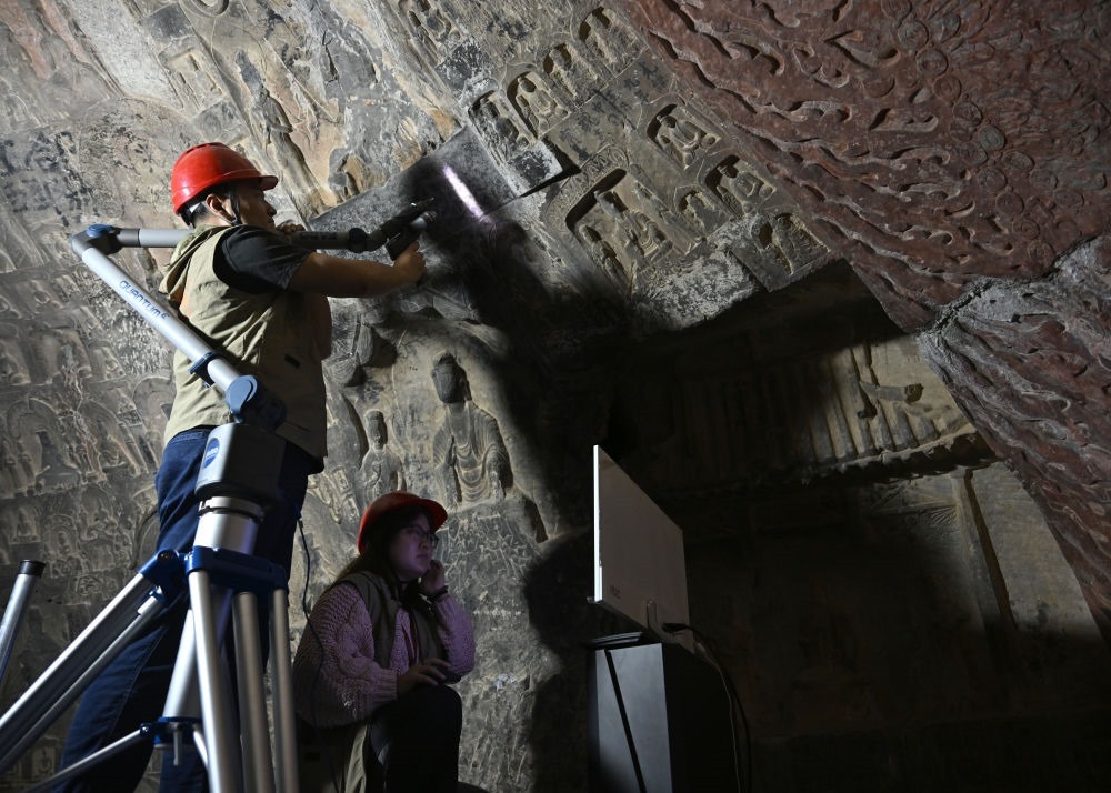 2025年4月9日,龍門石窟研究院工作人員在古陽洞使用關(guān)節(jié)臂掃描儀對(duì)像龕進(jìn)行數(shù)字化掃描。