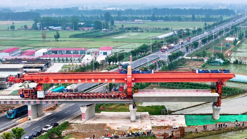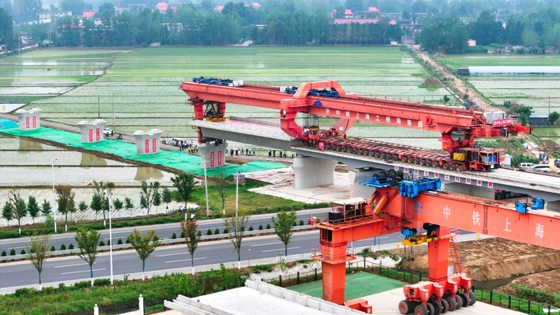 6月21日,在濰宿高鐵郯城沭河特大橋施工現(xiàn)場,中鐵上海局工作人員在進(jìn)行箱梁架設(shè)(無人機(jī)照片)。