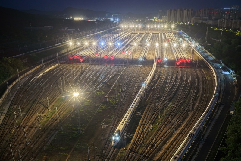 6月30日,動(dòng)車組列車駛出南京動(dòng)車段南京南動(dòng)車運(yùn)用所(無(wú)人機(jī)照片)。
