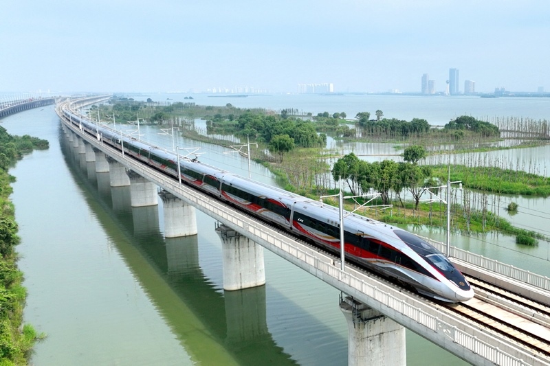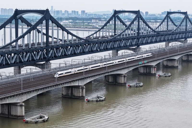 6月30日,一列動(dòng)車組列車經(jīng)過(guò)武漢天興洲大橋延長(zhǎng)線(無(wú)人機(jī)照片)。
