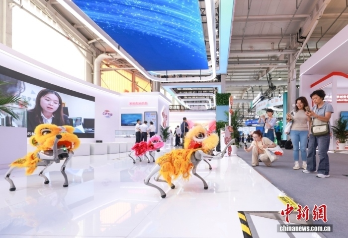 9月10日,2025年中國國際服務(wù)貿(mào)易交易會在北京首鋼園開幕。圖為觀眾參觀機器狗群舞表演。中新社記者 賈天勇 攝