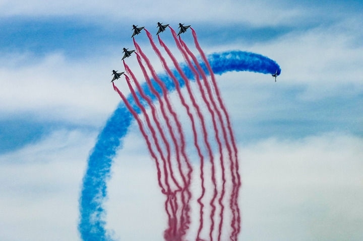 10時許,空軍航空大學“紅鷹”飛行表演隊采取雙四機超密集編隊起飛,拉開飛行表演序幕。8架紅白藍涂裝的教-8飛機完成機群集合后,以經典的“紅鷹”編隊動作通場,八機鉆石斤斗、六機快滾、雙機點贊、單機盤旋繞軸、七機開花等19個動作高水平呈現(xiàn)。
