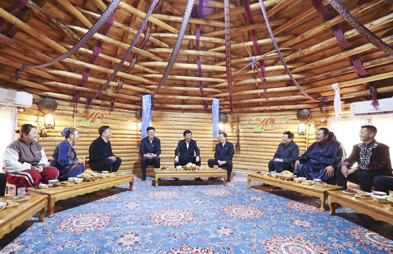 9月27日,受習近平總書記囑托,中共中央政治局常委、全國政協(xié)主席、中央代表團團長王滬寧帶領中央代表團部分成員到阿勒泰地區(qū)布爾津縣考察。這是王滬寧和中央代表團部分成員在扎拉特鄉(xiāng)村旅游專業(yè)合作社同村民交流。新華社記者 姚大偉 攝
