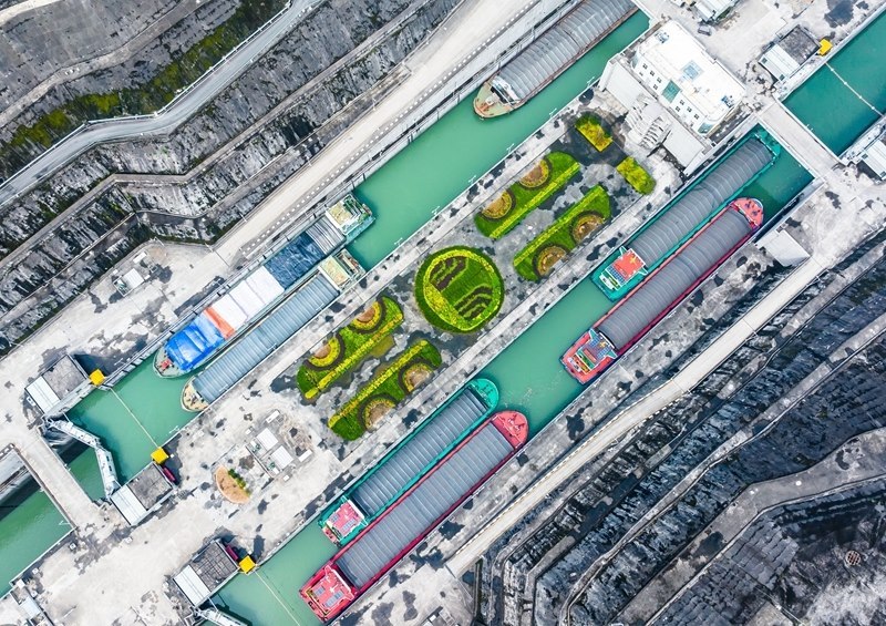 7月1日,在湖北宜昌,船舶有序通過三峽雙線五級船閘(無人機照片)。