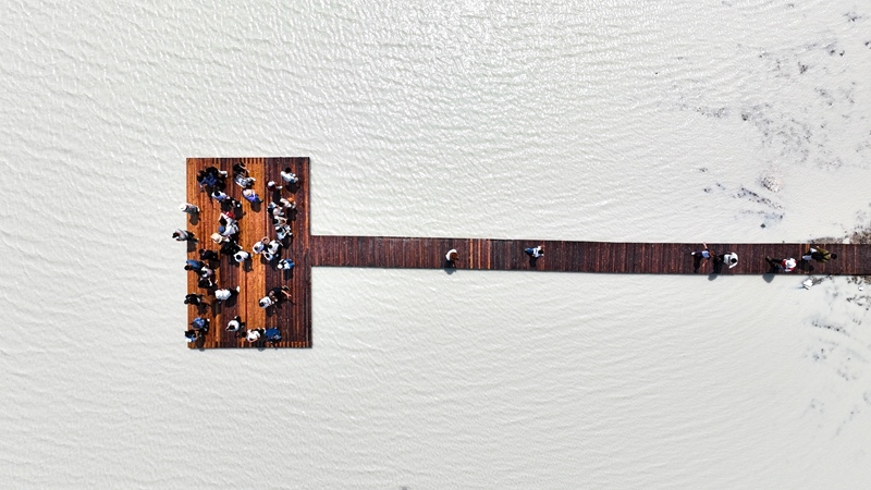 7月11日,游客在內(nèi)蒙古錫林郭勒盟太仆寺旗白音查干湖游玩(無人機照片)。