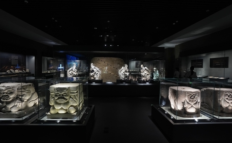 7月9日在西夏陵博物館拍攝的西夏陵出土文物紅砂巖石雕力士志文支座。