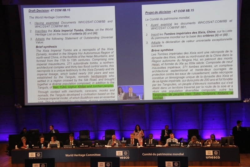 7月11日,在法國巴黎召開的聯(lián)合國教科文組織第47屆世界遺產(chǎn)大會審議將“西夏陵”列入《世界遺產(chǎn)名錄》的決議草案。