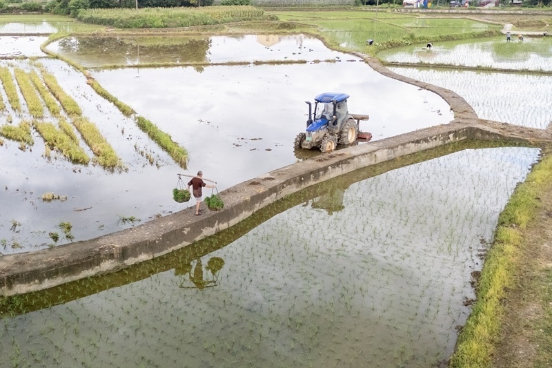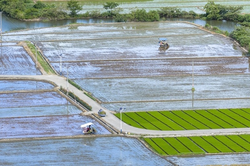 7月21日,農(nóng)民在湖南省婁底市雙峰縣荷葉鎮(zhèn)長(zhǎng)塘村的田間插秧。