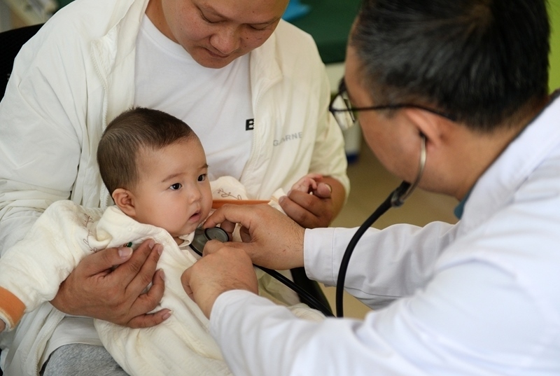 在貴陽市觀山湖區(qū)婦幼保健院,參加“天使之旅——先心病患兒篩查救助行動(dòng)”的山東第一醫(yī)科大學(xué)附屬中心醫(yī)院醫(yī)療專家在為孩子做檢查(2025年4月22日攝)。新華社記者 劉勇貞 攝