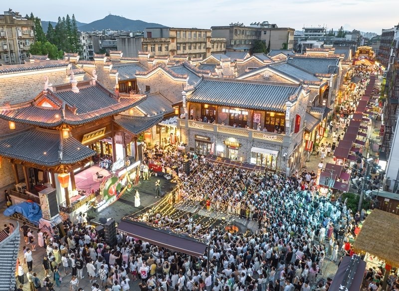 7月25日,游客在湖北省襄陽(yáng)古城管家巷文化休閑街區(qū)觀看星光音樂(lè)會(huì)(無(wú)人機(jī)照片)。
