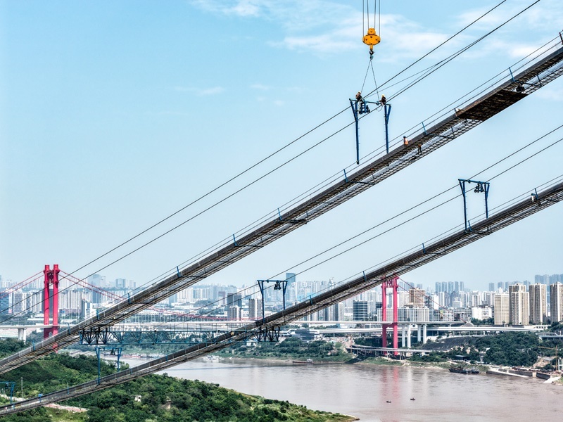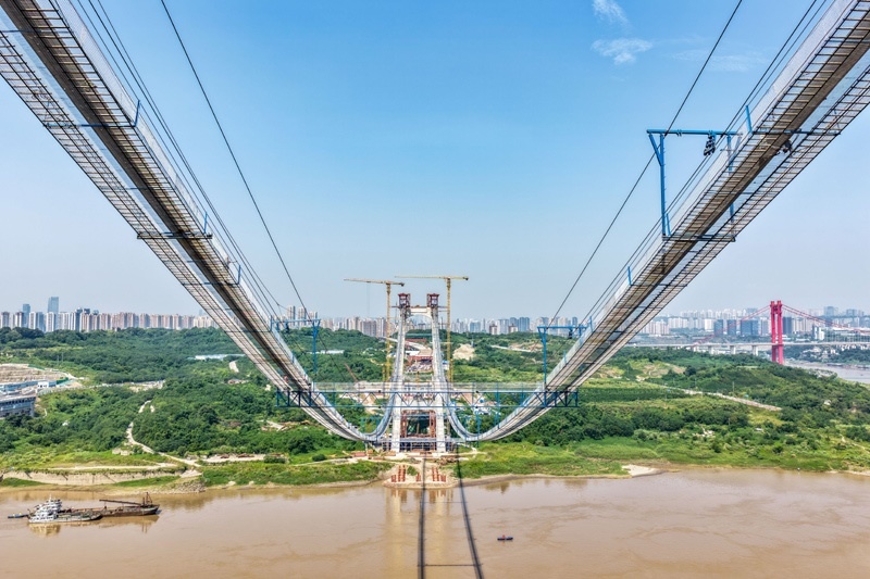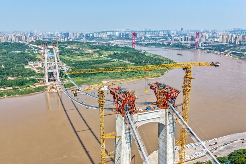 當日,由重慶城投集團投資、城投建設公司組織建設、中國鐵建大橋局承建的黃桷沱長江大橋順利完成主纜架設工作,標志著大橋建設即將進入鋼桁梁吊裝工序。黃桷沱長江大橋全長1260米,主跨765米,為單跨懸吊雙塔三跨連續(xù)鋼桁梁懸索橋,是國內(nèi)最大跨徑公軌兩用懸索橋。黃桷沱長江大橋是渝長高速復線連接道工程的控制性節(jié)點工程,建成后將成為聯(lián)系重慶主城區(qū)長江南北兩岸的重要交通干道。