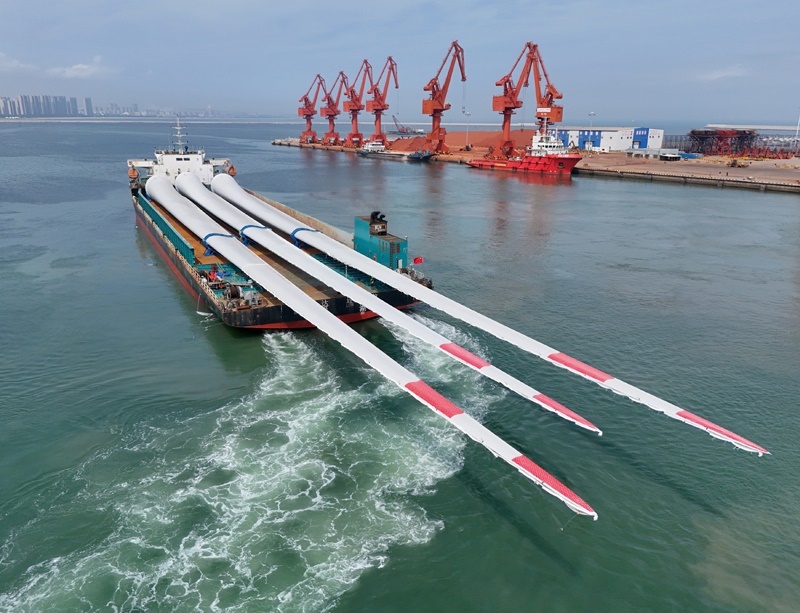 8月1日,超大尺寸海上風(fēng)電葉片從山東港口煙臺港蓬萊港區(qū)起運(無人機照片)。