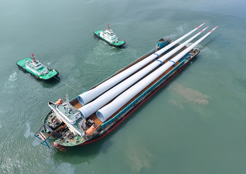 8月1日,三支超大尺寸海上風(fēng)力發(fā)電機試驗葉片在山東港口煙臺港蓬萊港區(qū)完成裝船并運往試驗基地。該型葉片長達153米,重83.5噸,屬于150米級超大尺寸海上風(fēng)電葉片,現(xiàn)已完成全部靜力測試,即將在試驗基地進行疲勞測試驗證。