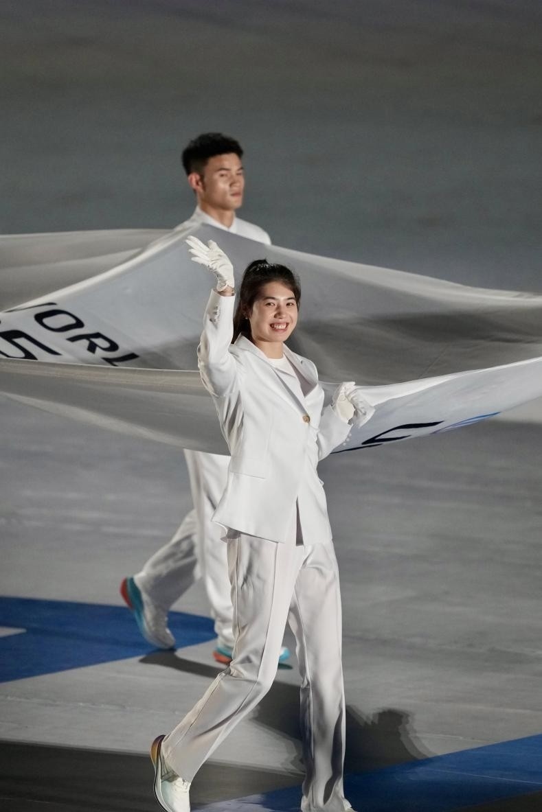 開幕式在《繽紛之約》表演中拉開序幕,街舞與輪滑、滑板、啦啦操等運動元素碰撞出青春火花激情開場。倒計時焰火組成的篆體“成都”字樣,將傳統(tǒng)文化與現(xiàn)代科技巧妙結(jié)合。來自全球的運動員在吉祥物“蜀寶”“錦仔”的歡迎下入場,手持融入蜀繡、漆藝等非遺工藝的引導(dǎo)牌,踏上榮耀之路。